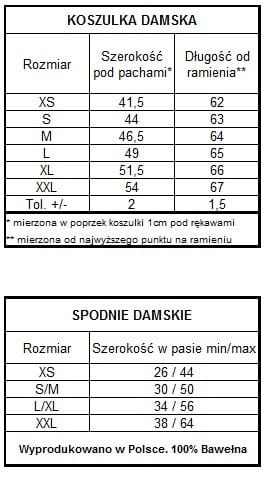 Rozmiary można dobrać według potrzeb - np. koszulka w rozmiarze S, a spodnie L/XL.